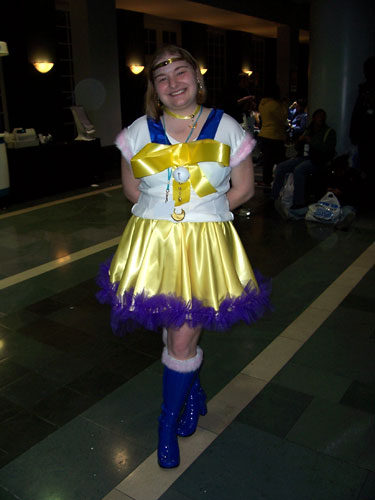 Saturday, March 22 Saturday we slept in really late, since we'd been up into the wee hours of the morning the previous night. When we finally got up around noon, I decided I wasn't going anywhere until T.M. Chiba's Cosplay Court Case event at 3 PM, since I was tired and it takes me an hour to get my cosplay on. Aarana got us croissants for "breakfast," and I lazed around for a while since I was still really tired. ;_; I did get some more work done on Aarana's wig, but there was still a long way to go, so unfortunately Aarana missed out on the cosplay fun. I felt bad. :( Tesh's Sailor Pluto cosplay was ready, though. When I finally stopped lazing around and got ready, I was running a little late. I told Aarana and Tesh to go ahead without me while I finished my makeup and got my costume on. Then I was even later getting to the panel, because I forgot it takes twice as long to get anywhere when you're in cosplay. I got stopped for pictures three or four times. ^^;; I had gotten an ominous text message from Aarana, and when I finally got to the panel my worries were confirmed. We had warned and warned T.M. Chiba that the Cosplay Court Case event needed more organization, and needed to be limited on how many people could participate. But he still let everyone up front who wanted to. -_- There was a giant mob on stage, it appeared to be chaos, and a lot of people were walking out when I got there. The open format had worked okay in 2007, but this year the event was in a bigger room that was completely full, so there were a ton more volunteers. Aarana had tried to help but eventually had to give up. :\ Things did seem to settle down in the last half of the panel, though. The strong characters emerged with some tactics that were actually pretty smart and funny, and it ended on a high note. Even so, the Cosplay Court Case is way too popular for such loose organization, and I hope T.M. Chiba nails down a more solid process before next year. I didn't get any pictures this time, since I was in cosplay and way at the back and had no idea what was going on by the time I got there. After that I think we got something to eat and checked out the Artist's Alley. I didn't have much money on me at the time, so I mostly just glanced at everything. By this point, I had flat-out taken the train off my dress. It came off practically every time someone bumped into me, and I knew it would never hold up in the Alley. The snaps were just not good enough. Aarana was an angel through the whole afternoon. She carried my bag and reattached my train every time it came off. I'm sure it got annoying, but she kept doing it like it was no big deal, and I was so grateful to her for that. ^___^ I found out my DS bag works well to carry stuff in when I'm in cosplay, so I might not have to put pockets in my dress after all, but it also had a tendency to disconnect my train. -_- Aarana also took some awesome pictures of me and Tesh in our costumes. ^^