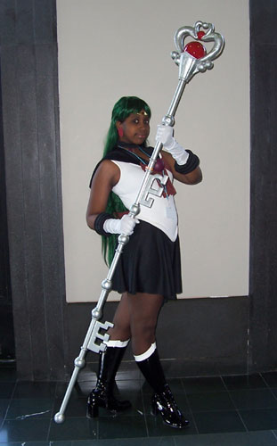 You know... I really, really love my Princess Pluto costume. I really do. Now that it's just about finished, I think it looks great, and it looks great on me. ^___^ I love the new wig (although I need to fix the bangs), it's a much better color and the bun's in a much better position (although I think the cap stiffened up with all the dye rinsing, it seems smaller than my old one and slides a bit ;_;). The staff is FINALLY 100% done, and I have the jewelry and everything I need, and I love it. ^_____^ Still too much of a pain in the ass to wear on more than one day, though. @_@ I've also resolved to start carrying around a picture of Pluto in her princess dress. So many people have no idea what the Senshi's princess forms look like. They could only identify me by the staff. It's kind of disturbing. Wearing wigs makes my brain stupid. The new one is really tight and uncomfortable, and it tends to make me zone out a bit or get a nasty headache. So we went back to the hotel room so I could take it off for a while before the Masquerade. On the way out of the convention center, we ran into the Neptune and Uranus cosplayers that had been wearing the awesome musical costumes last year. They were wearing the normal fuku this year, and grabbed Tesh so they could take pictures together. A bunch of people crowded around and took pictures of them. :D